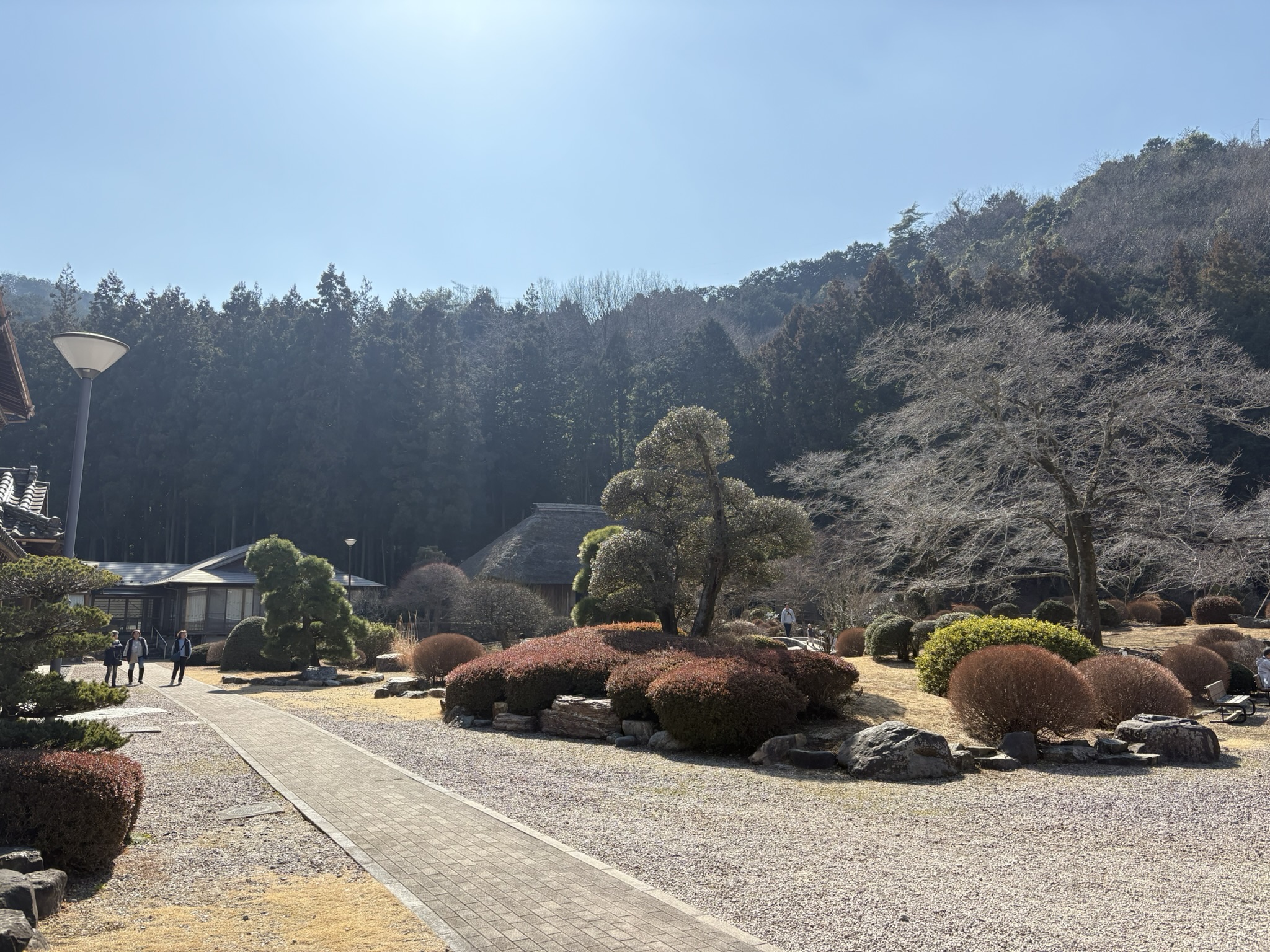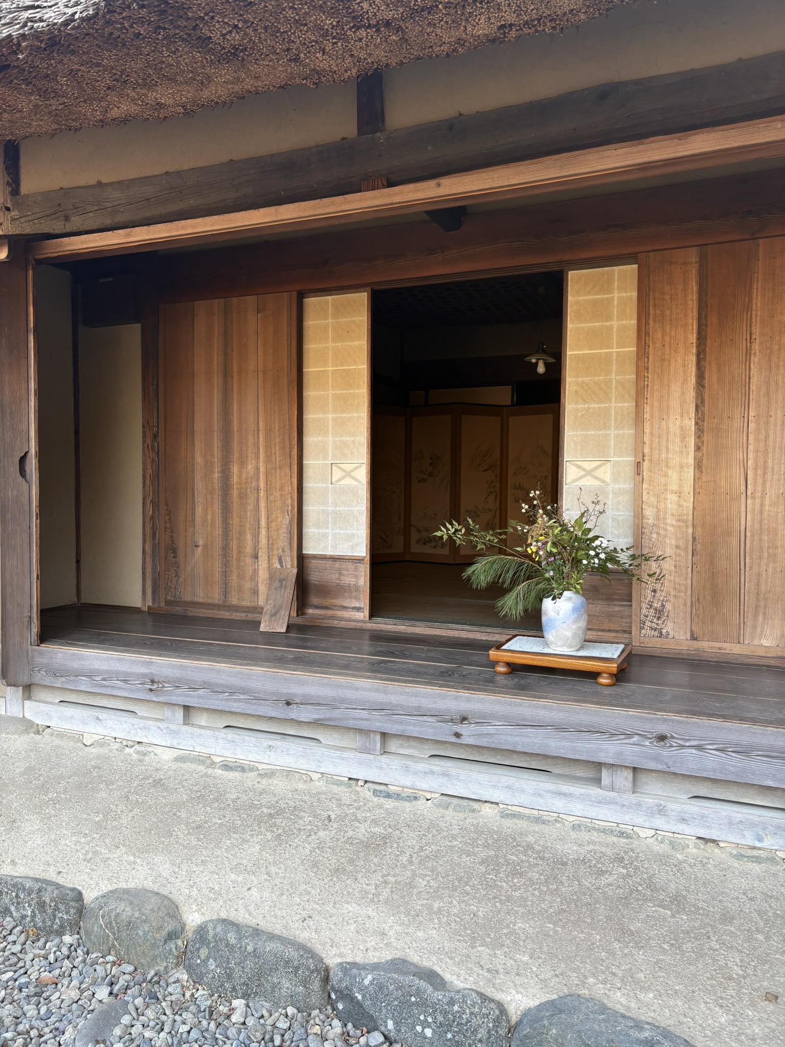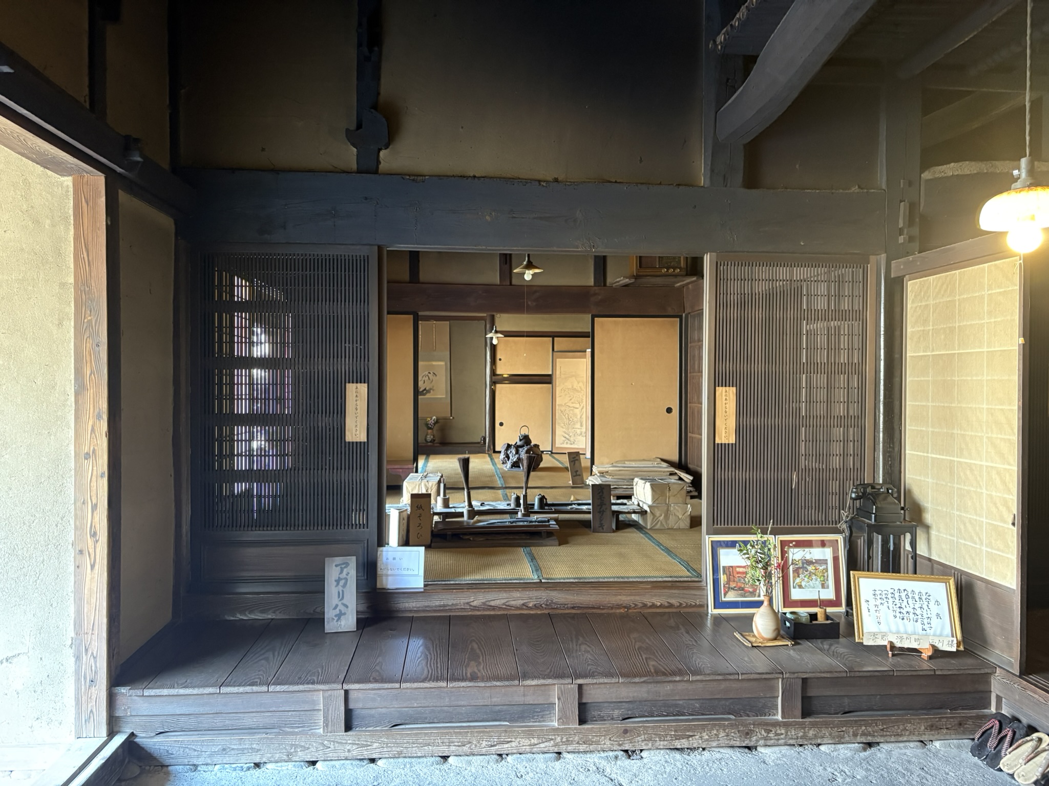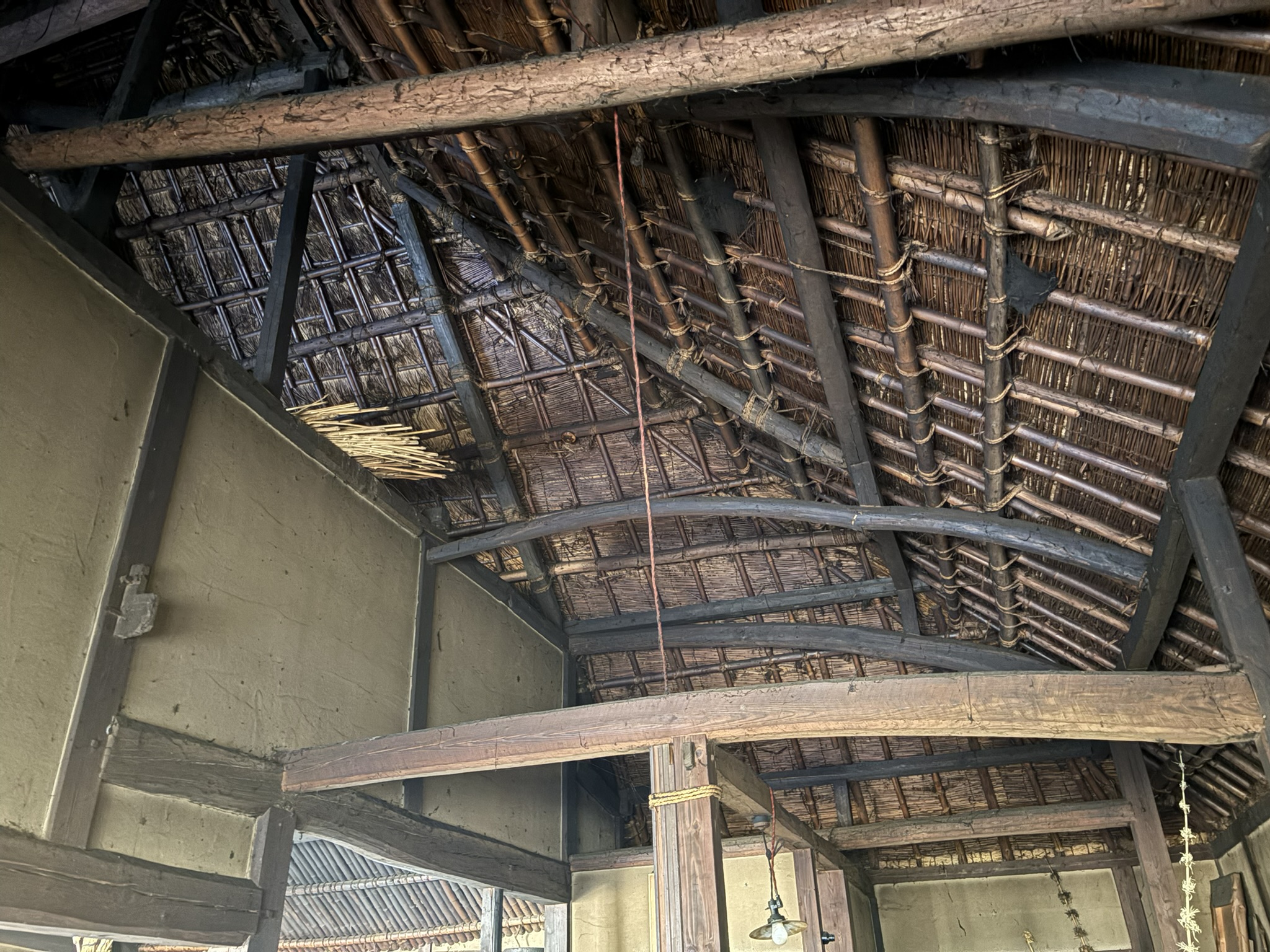 かやぶき屋根内は午前中のみいまだに囲炉裏にて燻し続けているみたい