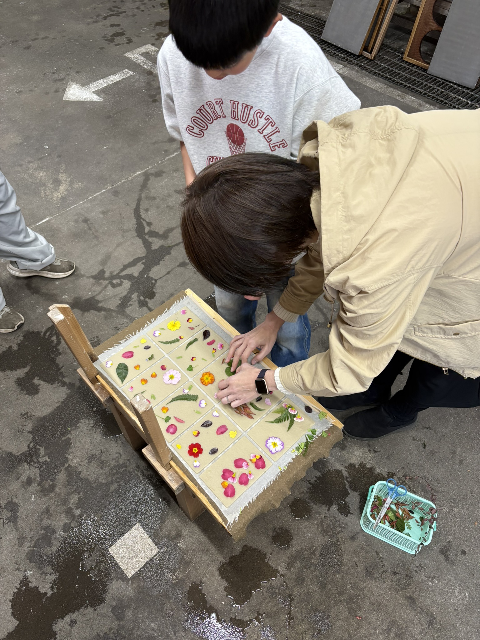 様々な植物を敷地内より摘み絵葉書サイズにかたどった和紙のもとパルプ繊維を水抜きしたものに配置していきます。